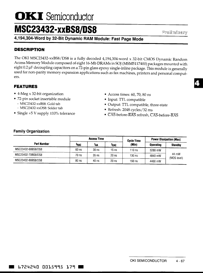 Fast Page DRAM Module, 4MX32, 80ns, CMOS, PSMA72,
