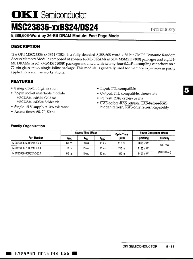 Fast Page DRAM Module, 8MX36, 70ns, CMOS, PSMA72,