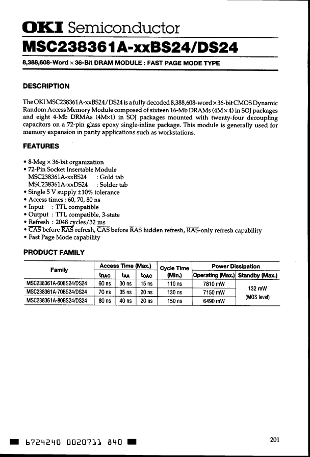 Fast Page DRAM Module, 8MX36, 70ns, CMOS, PSMA72, |