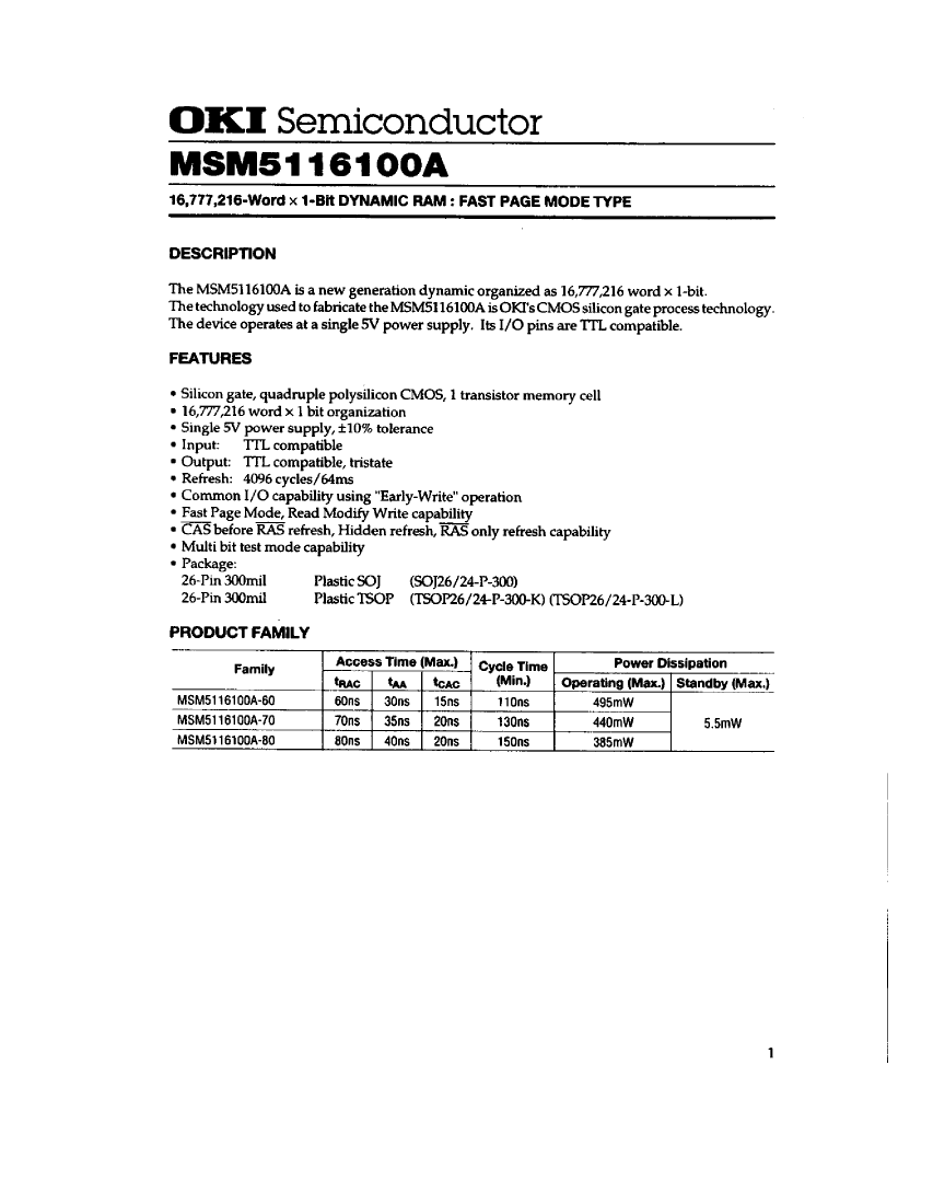 Fast Page DRAM, 16MX1, 80ns, CMOS, PDSO24 |