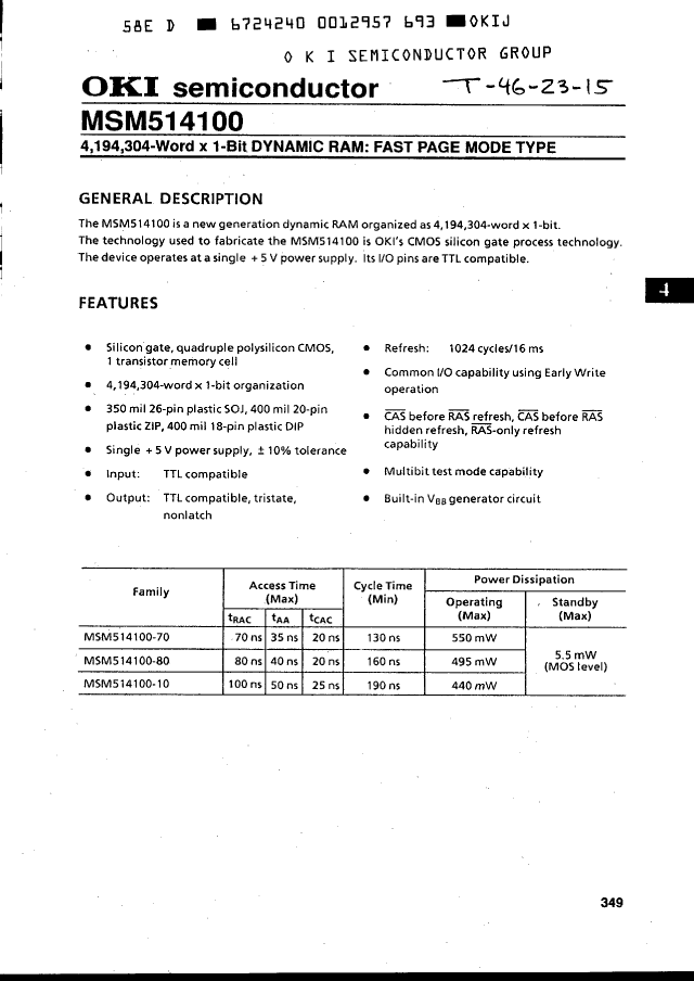 Fast Page DRAM, 4MX1, 100ns, CMOS, PDIP18 |