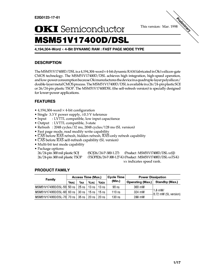 型号 MSM51V17400DSL-70TS-K MSM51V17400D-70TS-K MSM51V17400D-60TS-K MSM51V17400D-50SJ MSM51V17400D-70SJ MSM51V17400DSL-60TS-K