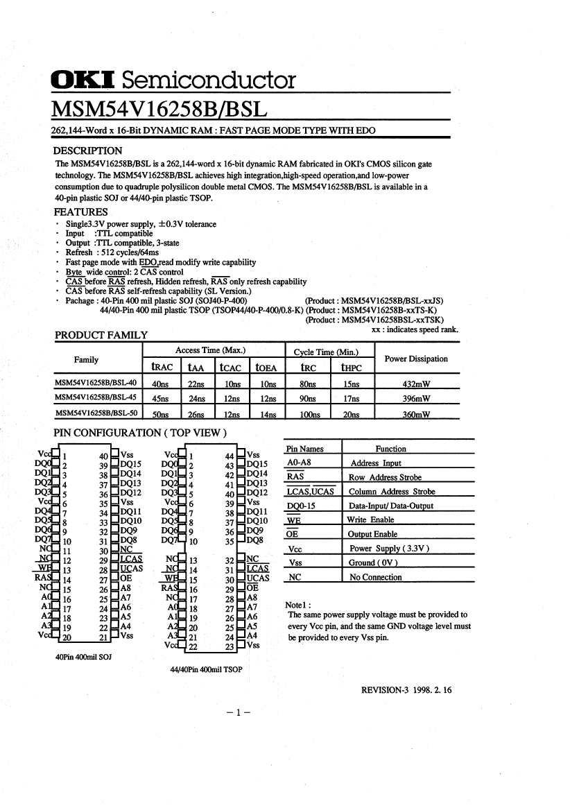 EDO DRAM, 256KX16, 45ns, CMOS, PDSO40, 0.400 INCH, PLASTIC, SOJ-40