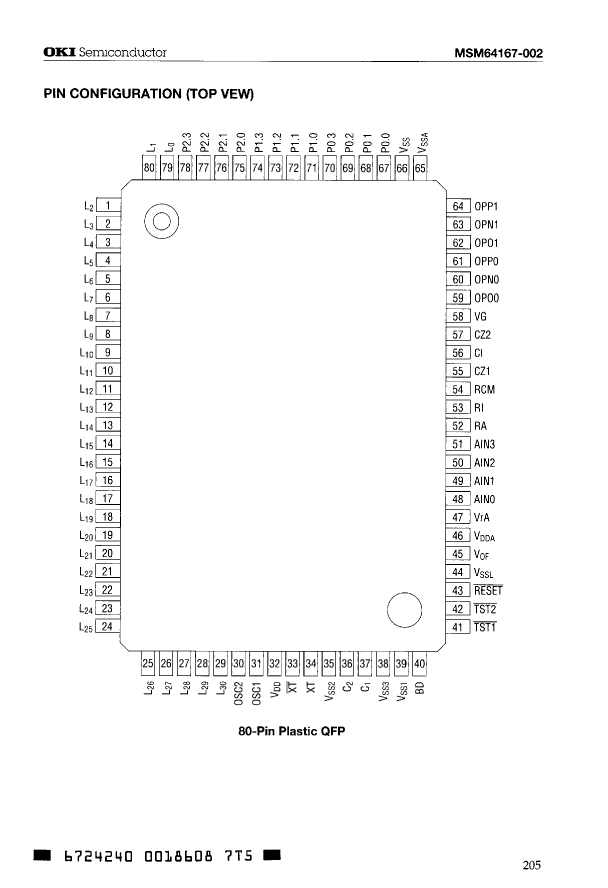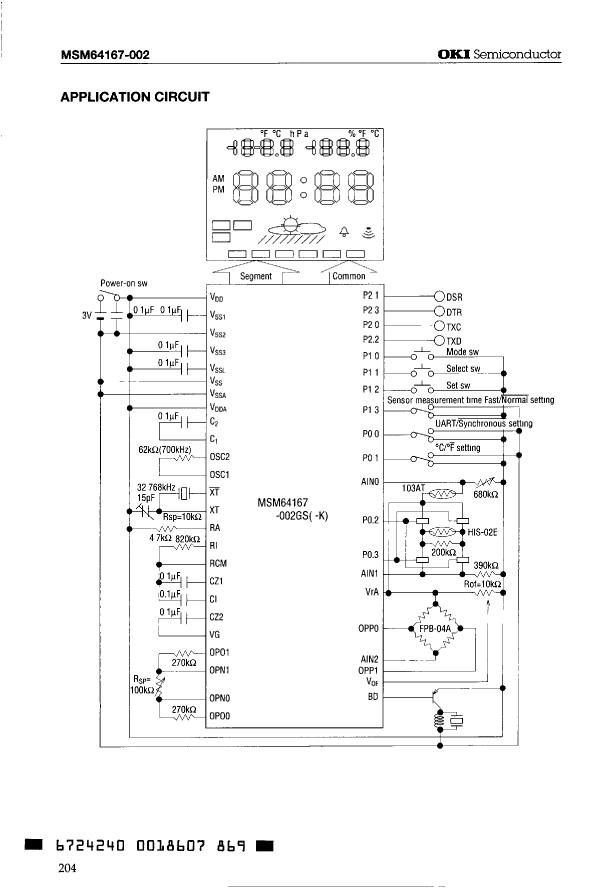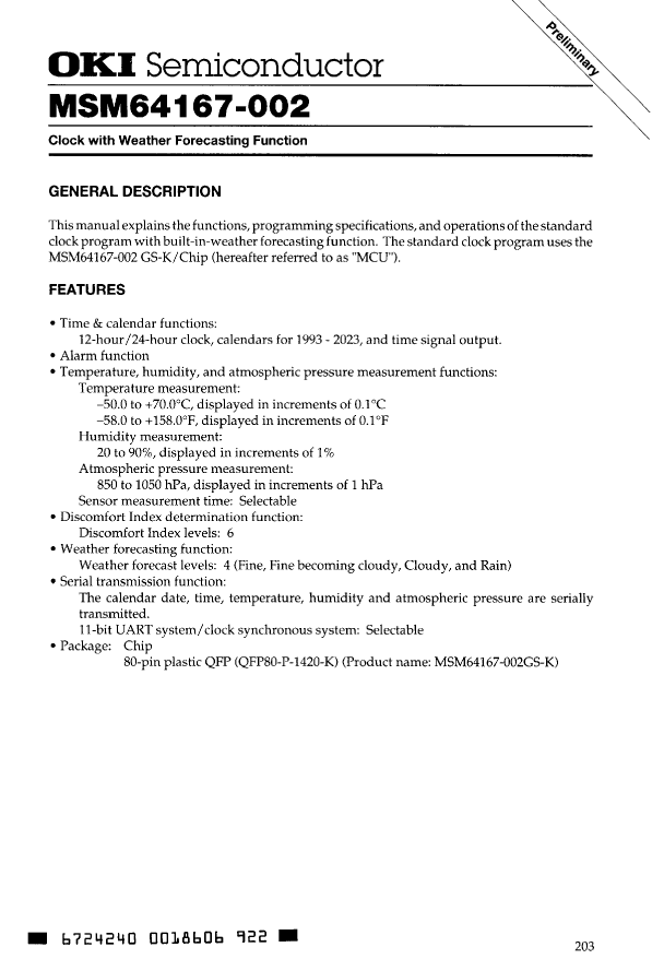 MSM64167-002 是一款集成了时钟与天气预测功能的微控制器芯片,采用 80 脚塑料 QFP 封装。该产品设计用于提供精准的时间管理和环境监测能力,适用于智能家居设备、气象仪器等应用场景。其核心架构支持多种传感器接口,确保高效的数据处理与显示。通过低功耗设计,该芯片能在多种环境下稳定运行,满足长期使用需求。