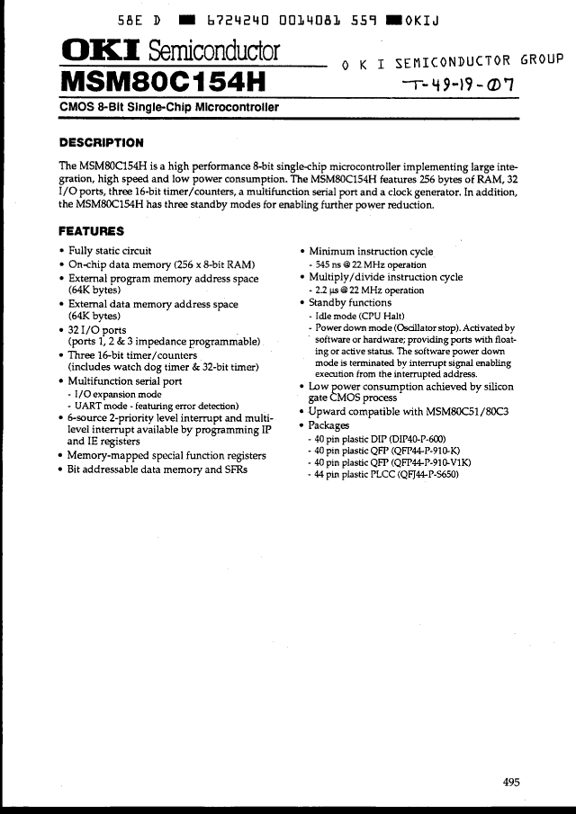 Microcontroller, 8-Bit, 8051 CPU, 22MHz, CMOS, PQCC44
