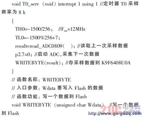 以8 kHz 的采样频率启动ADC0809,并读取上次采样结果,写到外扩Flash 存储器的代码片段如下: