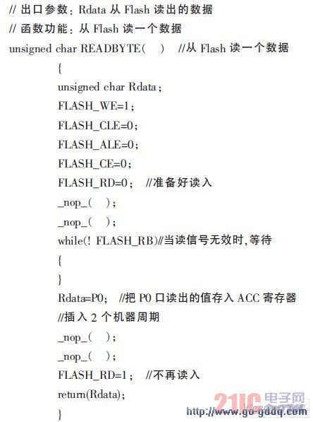 若P1.0 按下,则执行放音程序。放音过程实质上是读取外围数据存储器中的数据,将其转化为一定宽度的PWM 波,进行输出的过程。读取K9F6408U0A 的子函数如下: