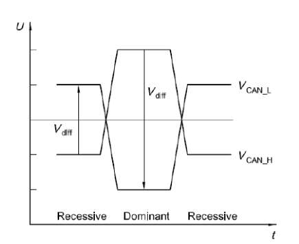 在接收状态,VCAN_L和VCAN_H固定在平均电平,由总线终端决定。Vdiff低于最大阈值时,接收状态在总线空闲和接收数据位期间传递。