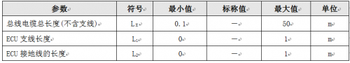 LS-CAN网段拓扑结构采用总线型拓扑结构,如图3所示,具体数值见表1。通信速率是125 k~500kbit/s,除此之外,还需要满足下列技术要求: