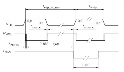 内部延时tnode测量应当在通过在空闲状态,错误有效的CAN节点的CAN总线输入一个发送位。CAN节点应当认为这个发送位为帧的起始位并执行硬件二次同步。CAN控制器应当在发送位后的第六个接收位检测到填充错误,并且作为有效的错误标志响应。外部发送发送位到错误标志开始之间的时间为tedge to edge.