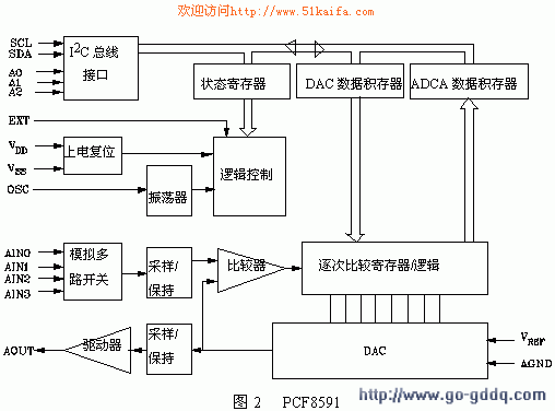 A/D转换器PCF8591靠数据线SDL和时钟线SCL与CPU联系。由软件决定水温数据的采集时间和数据的存储以及送去显示。