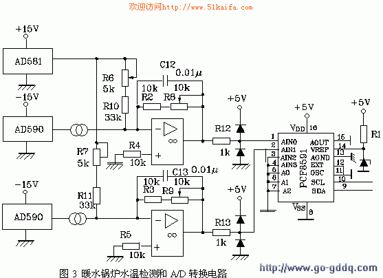 如图3所示电路是暖水锅炉水温检测和A/D转换电路。AD581作为电流型温度传感器AD590的基准电源。两只AD590分别用来采集上水和回水的温度。