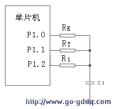 P1.0、P1.1和P1.2是 单片机 的3个I/O脚,RK为100k的精密电阻,RT为100K-精度为1%的热敏电阻,R1为100Ω的普通电阻,C1为0.1μ的瓷介电容。其工作原理为:
