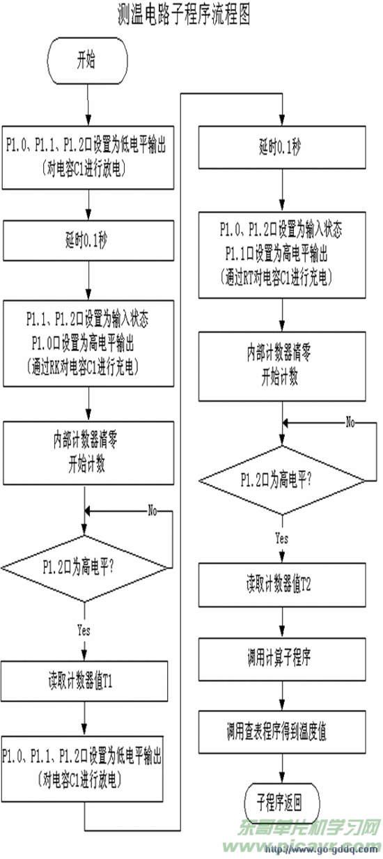将P1.1、P1.2设置为输入状态,P1.0设为高电平输出,通过RK电阻对C1充电, 单片机 内部计时器清零并开始计时,检测P1.2口状态,当P1.2口检测为高电平时,即C1上的电压达到单片机高电平输入的门嵌电压时,单片机计时器记录下从开始充电到P1.2口转变为高电平的时间T1。