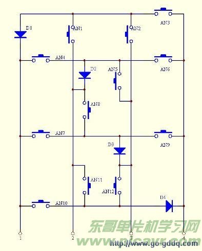 这里以4根I/O线为例,普通接法只能接4个键,本文介绍的电路是在组合接法的基础上增加了4个二极管。其软件处理使用了端口扫描检测方法,从而使按键数可达到12个,同时由于采用了组合逻辑来直接对端口进行读取,因此极大地简经了程序的处理过程。下图是该电路的电路原理图。 也可以根据此原理图类是做3线、5线等的键盘。