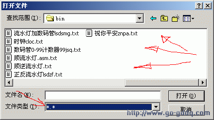 启动伟福e2000,e51,g6s,g6w编程、仿真、编译集成环境,运行主菜单中的:文件>打开文件,在弹出的对话框中选择你要打开的刚才已经写好的*.TXT文件 |