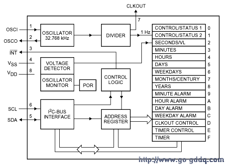 可编程时钟输出频率为:32.768KHz,1024Hz,32Hz,1Hz;