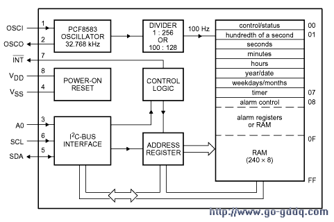 内置的32.768KHz振荡器和RAM的前8个字节用于时钟/日历和计数器功能。接下来的8个字节可作为报警寄存器或当作RAM来使用。剩下的240个字节都作为RAM由用户自由支配。