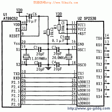图(1) AT89C52与SP2538的电路连接