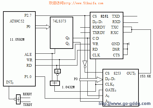 图(2)是用Intel8251扩展一个串行通道的电路原理,图中,11.0592MHZ晶振经ALE6分频后于 、组合,产生1.8432MHZ的时钟频率,分别作为8251与8253的时钟输入,若设定8251通信波特率为9600bps,波特率因子为16,则需要 153.6KHZ的接收/发送时钟频率,该频率可由8253的OUT0产生。