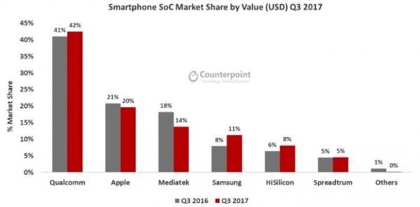 据counterpoint发布的数据,2017年全球前六大手机芯片企业当中,仅有苹果和联发科的市场份额出现了下滑,高通、三星、华为海思的市场份额取得了增长,展讯持平,苹果的市场份额出现下滑估计是受新iPhone销售不佳的影响。