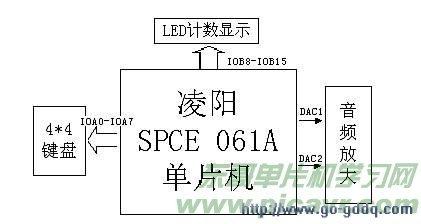 我们知道,声音的频谱范围约在几十到几千赫兹,若能利用程序来控制 单片机 某个端口的“高”电平或低电平,则在该端口上就能产生一定频率的矩形波,接上喇叭就能发出一定频率的声音,若再利用延时程序控制“高”“低”电平的持续时间,就能改变输出频率,从而改变音调。乐曲中,每一音符对应着确定的频率,这个小制做是采用凌阳SPCE061A的DAC输出来实现,具体做法是,先建立一个有两百个数据的音频数据表,当按不同的按键即以不同的频率往DAC上送数据,从而达到输出不同音符的目的,为了达到电子琴的效果,当然还得在程序方面稍作修饰了,整体框图如图一所示。下面将就具体硬件电路和程序作一一说明。