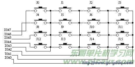 在这里采用矩阵式排列键盘,如图二所示,这样可以合理应用硬件资源,把16只按键排列成4*4矩阵形式,用一个8位I/O口控制如图所示。把键盘上的行和列分别接在IOA0~IOA3和IOA4~IOA7上。
