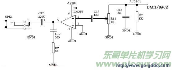 凌阳SPCE061A 单片机 自带双通道DAC音频输出, DAC1、DAC2转换输出的模拟量电流信号分别通过AUD1和AUD2管脚输出, DAC输出为电流型输出,经LM396音频放大,即可驱动喇叭放音,放大电路如图三(只列出了DAC1,DAC2类似)。在DAC1、DAC2后面接一个简单的音频放大电路和喇叭就能实现语音播报功能,这为单片机的音频设计提供了极大方便,音频的具体功能主要通过程序来实现。