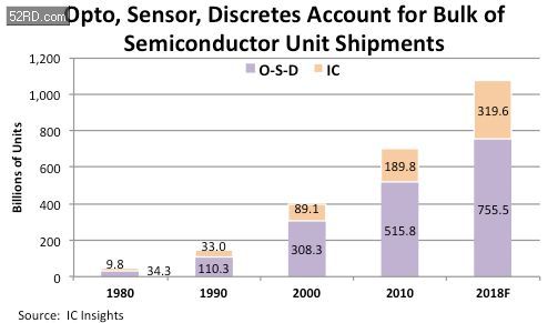 预计全部半导体出货量的百分比将继续偏向O-S-D器件。在2018年,预计O-S-D器件占半导体器件总数的70%,而集成电路器件的比例为30%。三十年前的1980年,O-S-D器件占半导体器件的78%,IC占22%(图2)。