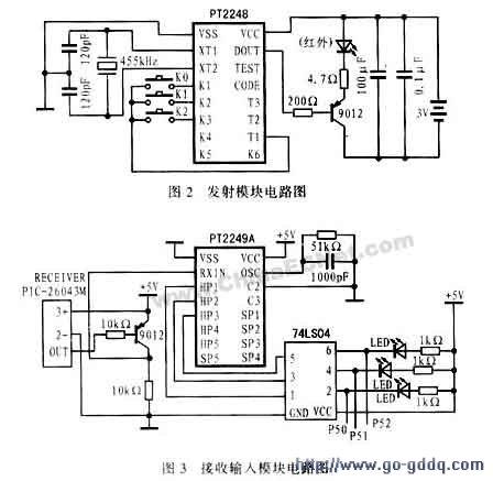 本遥控控制系统中的接收模块采用5V工作电压,且在该电路板上有一个接收器,可用以接收发射模块传送过来的信号。利用一个放大电路可将接收到的信号放大并传送到接收专用芯片PT2249A,然后再通过74LS04处理后送给 单片机 。可用三个发光二极管分别对应于发射模块的三个按键以显示操作。当按下某一个键时,与之对应的发光二极管发光。其硬件电路如图3所示。
