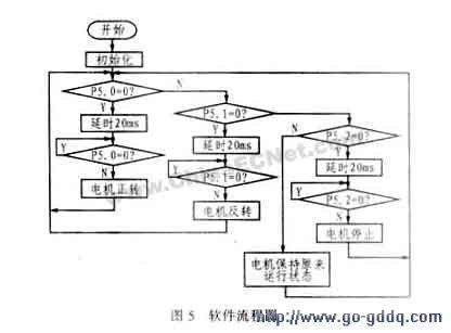 单片机 上的P5.0~P5.2引脚分别作为电机正转、反转和停止的信号输入端,P6.0、P6.1引脚分别作为电机正转、反转的信号输出端。要使电机停止操作,只要将无效信号送入P6.0、P6.1即可。单片机的输出信号经74LS04反向并送入ULN2003A进行放大后,即可驱动继电器以使直流电机作相应操作。