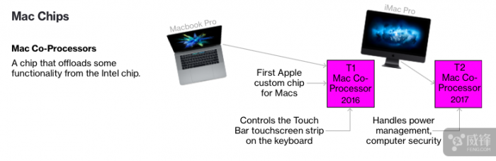 现在 Mac 系列中,除了 iMac Pro 之外,带 Touch Bar 的 MacBook Pro 也拥有一颗 T1 协处理器,而在2018年,苹果计划在至少三款 Mac 机型中加入协处理器,其中包括至少两台 MacBook 和一款全新的 PC(应该是新 Mac Pro )。T 系列协处理器并不起到计算作用,主要用于 Touch Bar 控制、Touch ID 指纹存储、SSD 控制、摄像头 ISP 和安全防护等方面。