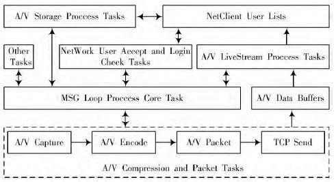 系统软件架构如图1 所示,它是音视频单向采集、压缩、传输、接收、解压缩、处理回放音视频流控制过程,各个模块采用线程处理,由信号量处理线程间优先级构成循环的线程,有效地处理了音视频数据流。系统各功能模块化,便于修改和移植,代码简短精悍。