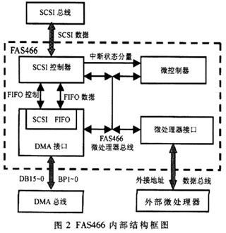 FAS466区别于其他SCSI协议处理器的最大特点是:它采用微处理器和DMA接口结构,而常见的SCSI协议控制器采用PCI接口总线结构。这是本设计采用FAS466的一个主要原因。采用微处理器和DMA接口结构,可以通过DSP对传输进行控制,脱离微机平台,减少传输带宽限制,使数据存储系统具有非常好的灵活性和可移植性。FAS466由SCSI控制器、微控制器、DMA接口和微处理器接口四个模块组成。外部微处理器通过微处理器接口对FAS466进行控制,协议控制器接受微处理器的操作指令,如总裁、选择、失连、复位总线等。SCSI控制器提供灵活、有效的底层SCSI协议控制,微控制器则负责控制数据从DMA接口到SCSI硬盘的传输以及各个模块之间的协调。FAS466的内部结构如图2所示。