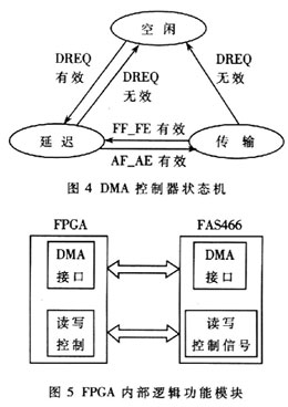 FAS466外部DMA控制器由FPGA实现。FAS466通过DREQ信号有效请求数据传输,当DMA控制器检测到DREQ有效并且外部FIF0非空时,使DACK有效并通知FAS466开始DMA传输。DMA控制器的状态机如图4所示。