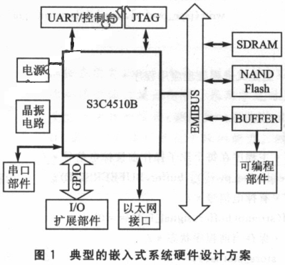 图1是一种典型的嵌入式系统硬件设计方案。系统的微处理器采用S3c4510B,是基于ARM7体系结构的。SDRAM是一种易失性存储器作为程序的运行空间,类似于PC机的内存;Flash作为程序存储空间是非易失性的。程序运行过程中的数据往往缓存在sDRAM中,在系统失电时必须写往Flash.