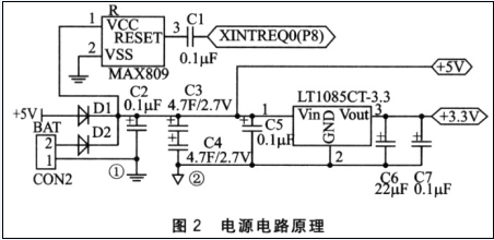 这个电源回路除了可以提供5v和3.3v的电源以外,还为系统掉电保护提供了延时及预警功能,通过软件的配合可以实现系统的掉电保护机制。正常情况下,由供电回路1给整个系统供电。当系统由于意外原因掉电时,由于输入的比较电压降低,这样MAX809 模块输出电压产生翻转为系统提供掉电中断预警信号,中断请求通过外部中断引脚XREQ0产生;同时供电回路2开始启用。通过大电容C3、c4放电,继续为系统提供一段供电电压,支持掉电中断服务程序完成。供电回路2只给最小系统供电,并不给耗电量大的外围部件供电。这样,给最小系统的供电时间足够长,可以完成敏感数据的保护操作。