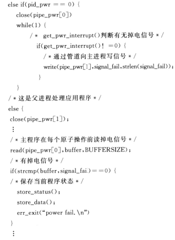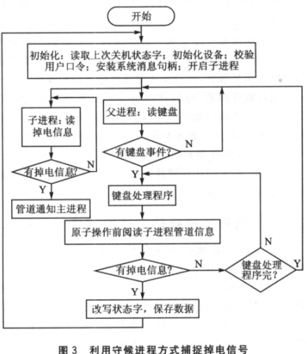 另一种方式是采用守候进程的方式,开通一个进程,此进程专门等待中断信号。主程序根据数据操作对象的不同,将自己的流程方案划分成若干原子操作,所谓原子操作即划定的程序块要么完全执行,要么不执行。每个操作对应惟一状态标志。在每个原子操作前,主进程都将会通过管道通信的方式阅读中断信号。如果中断信号产生,主进程首先保存状态标志,然后将相关数据写往Flash后退出,电源恢复后,主进程首先根据标志字确定系统恢复方案。图3用流程图的方式实现这一过程。