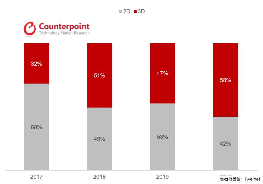 Counterpoint高级分析师Pavel Naiya指出:“在 Android 平台,目前已开始导入原生 2D 脸部辨识系统,因此预计现在旗舰机种搭载的功能中,脸部识别技术将比其他功能更快普及至低端机种”。Pavel Naiya 预估,2020 年搭载于智能手机的脸部识别系统约 60% 采用 3D 技术。