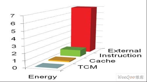 图2显示了A R M进行的一些研究。如果执行一条指令的能耗是1,那么,紧耦合存储器(TCM)存取的能耗约为1/25,缓存存取的能耗大约为1/6。而外部R A M存取的能耗则是指令执行能耗的7倍。