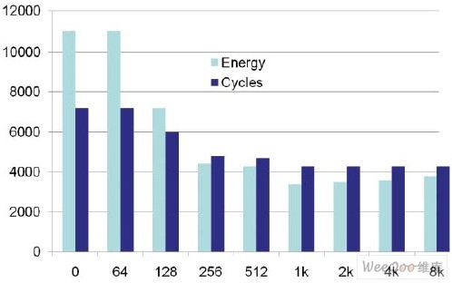 图3中的图表显示了简单的“多类”基准,甚至128个字节的S PM区域都可以减少大约一半的功耗。1k字节的存储器最大可减少70%的功耗。本次研究(Mar wedel, 2004)中采用的方法是从外部R AM到S PM动态重定位代码和数据片段。甚至在按需移动各项开销方面,不仅降低了能耗,性能也提高了大约60%。