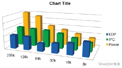 图4摘自普林斯顿(Brooks,2000)一份论文,显示了针对某简单应用基准的三套数据。针对不同的缓存大小,这些条块分别代表性能IP C(单位周期指令数)、功耗和功耗时间积(ED P)。总的来说,性能会随着缓存大小的增加而提升。但是,系统的功耗也会增加,因为增大缓存单元会相应增加功耗。功耗时间积允许我们在性能和缓存大小之间取得平衡。在这个例子里,存在一个最佳点,即缓存大小为64k时,此时的功耗时间积最小。