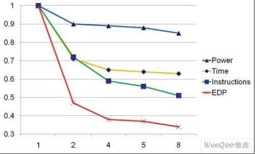 因此尽管执行时间基本上低于展开因子4,但是因为功耗持续降低,所以所有重要的功耗时间积也随之降低。因此有能耗意识的编译器或开发人员与只考虑执行时间的编译器或开发人员相比,会更倾向于展开循环。