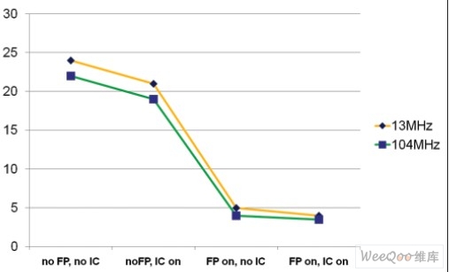 通常一个比较难的选择是启用计算组件提前完成计算(且因此切断时间更长)还是完成计算时及时降低处理器速度以减少功耗。图6显示了每次迭代的能耗数据,这是简单的基准(Domeika, 2009)。采用不同的指令缓存和浮点协处理器组合,对于两个时钟速度,每个时钟速度均要运行此基准四次。有两个清晰的重点。首先,尽管指令缓存和浮点单元均减少了能耗,但是浮点单元比指令缓存的表现更优异。