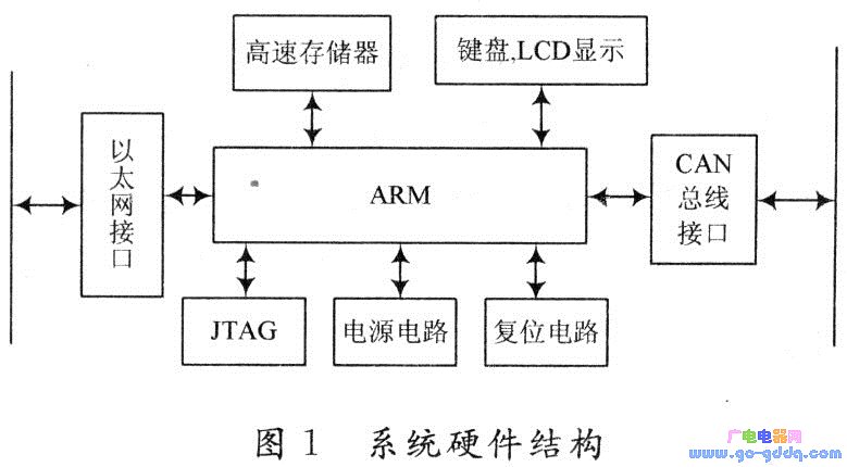 该系统的硬件部分主要由ARM、以太网接口、CAN接口、高速存储器、JTAG口、复位电路和电源等组成,其系统硬件结构如图1所示。ARM移植TCP/IP通信协议和CAN协议,可完成以太网协议和CAN总线协议转换,实现以太网接口和CAN接口通信数据的透明传输。以太网(Ethernet)指的是由Xerox公司创建并由Xerox、Intel和DEC公司联合开发的基带局域网规范,是当今现有局域网采用的最通用的通信协议标准。以太网络使用CSMA/CD(载波监听多路访问及冲突检测)技术,并以10M/S的速率运行在多种类型的电缆上。以太网与IEEE802·3系列标准相类似。