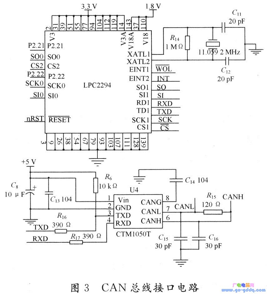 CAN总线接口由LPC2294和CAN总线收发器等构成。这里采用带隔离的高速cAN收发器CTMl050T,其主要功能是将CAN控制器的逻辑电平转换为CAN总线的差分电平,并且具有(DC2500V)隔离功能、ESD保护功能及TVS管防总线过压功能,其内带隔离器,可减少外部相关电路的设计。CAN总线接口电路如图3所示。CAN总线通过CAN收发器接口芯片82C250的两个输出端CANH和CANL与物理总线相连,而CANH端的状态只能是高电平或悬浮状态,CANL端只能是低电平或悬浮状态。这就保证不会在出现在RS-485网络中的现象,即当系统有错误,出现多节点同时向总线发送数据时,导致总线呈现短路,从而损坏某些节点的现象。而且CAN节点在错误严重的情况下具有自动关闭输出功能,以使总线上其他节点的操作不受影响,从而保证不会出现象在网络中,因个别节点出现问题,使得总线处于“死锁”状态。而且,CAN具有的完善的通信协议可由CAN控制器芯片及其接口芯片来实现,从而大大降低系统开发难度,缩短了开发周期,这些是仅有电气协议的RS-485所无法比拟的。