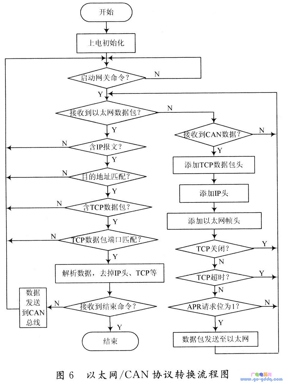整个设计中最为关键的就是CAN协议与TCP/IP协议的相互转换。协议转换流程图如图6所示。