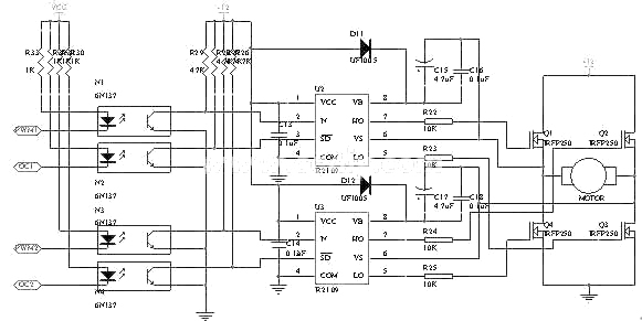 电动机的驱动电路主要包括FET桥式电路、FET基极驱动电路、电机驱动线路上的电流传感器和继电器构成。
