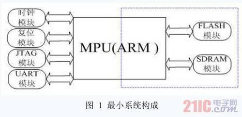 嵌入式最小系统即是在尽可能减少上层应用的情况下,能够使系统运行的最小化模块配置。对于一个典型的嵌入式最小系统,以ARM处理器为例,其构成模块及其各部分功能如图1所示,其中ARM微处理器、FLASH和SDRAM模块是嵌入式最小系统的核心部分。