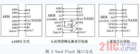 Nand Flash接口信号比较少,地址,数据和命令总线复用。Nand Flash的接口本质上是一个I/O接口,系统对Nand Flash进行数据访问的时候,需要先向Nand Flash发出相关命令和参数,然后再进行相应的数据操作。ARM处理器与Nand Flash的连接主要有三种方式,如图3所示: